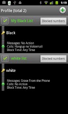 * Black list: Add individual numbers to be blocked, each number can be blocked in different ways, and you can add timers to each number. Also block UNKNOWN, PRIVATE or other restricted numbers, and option to block all numbers not in contact book.